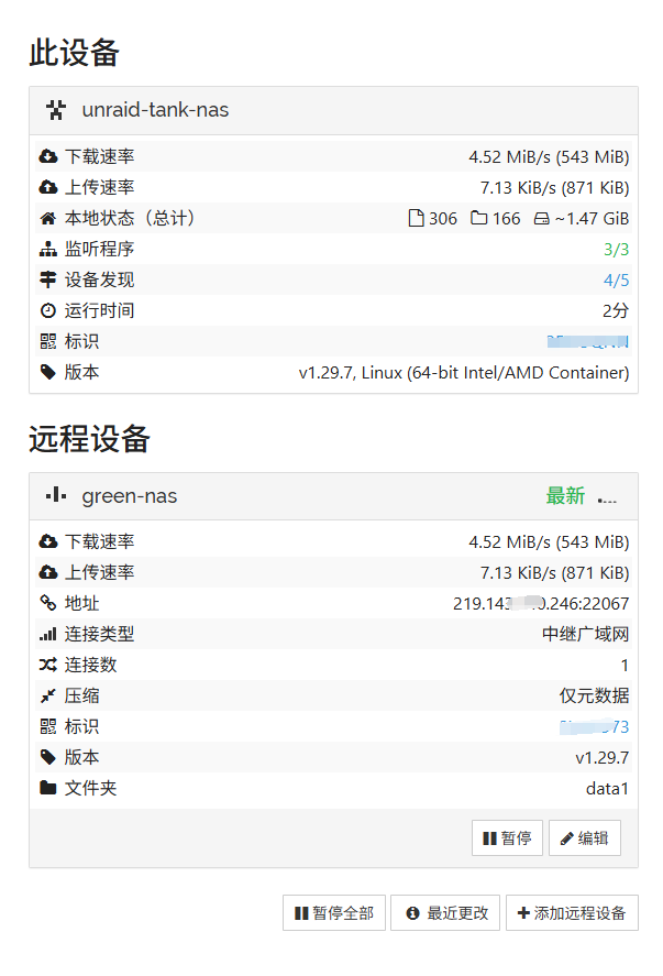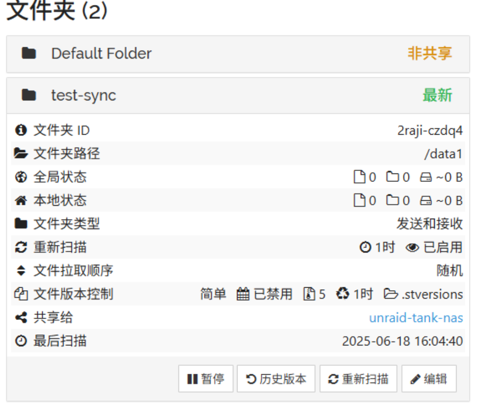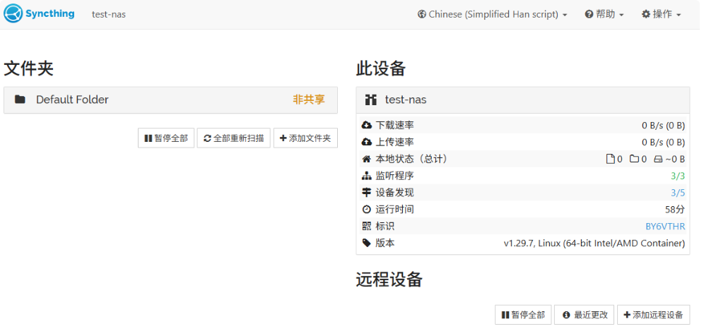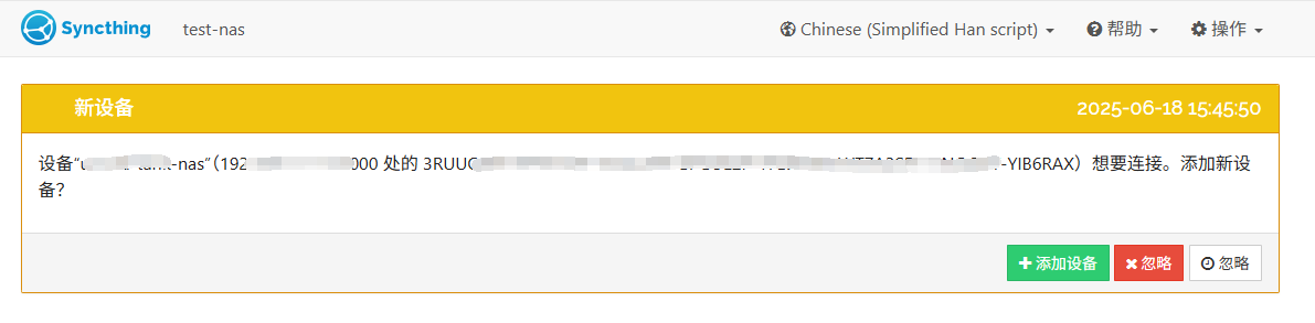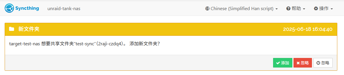 切换到对方设备的WebUI,可以看到同步文件夹请求,点击添加,会正式开始两个设备之间的同步工作。