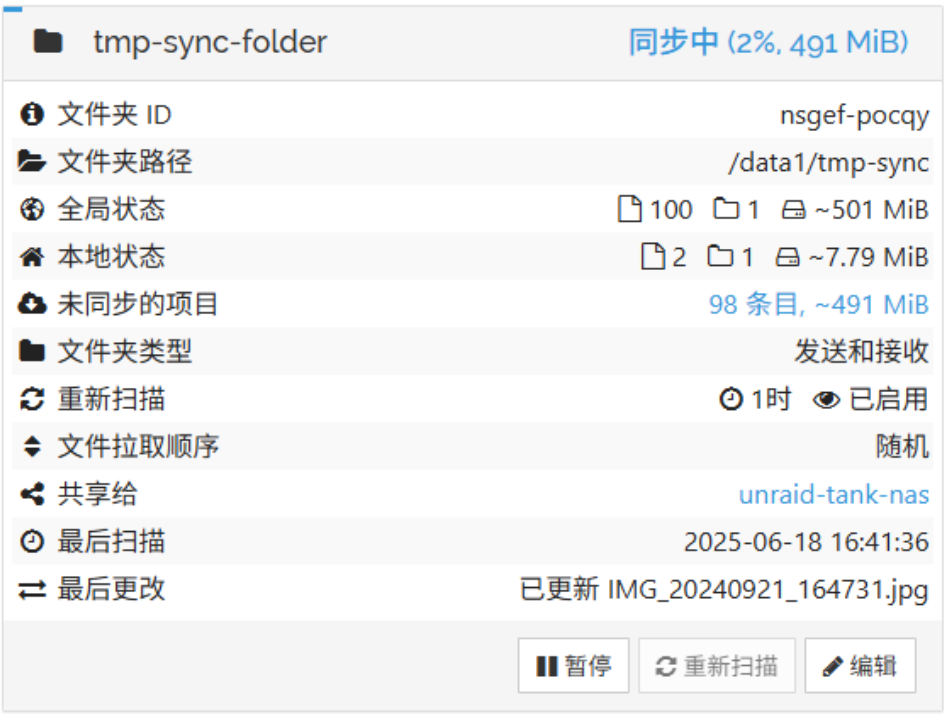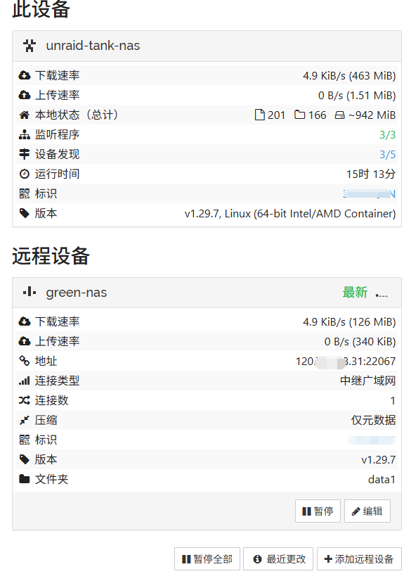 不过幸运的是,将两台设备的Syncthing容器网络都修改为Bridge后,传输速度就正常了,日志也没有异常信息。