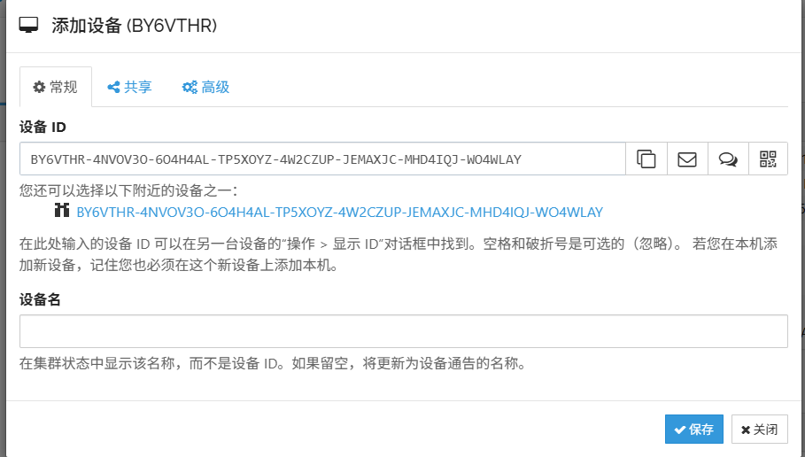 可以看到,在同一局域网下,Syncthing会自动搜索本局域网内的其它开启了Syncthing服务的设备,直接选择相应设备即可。