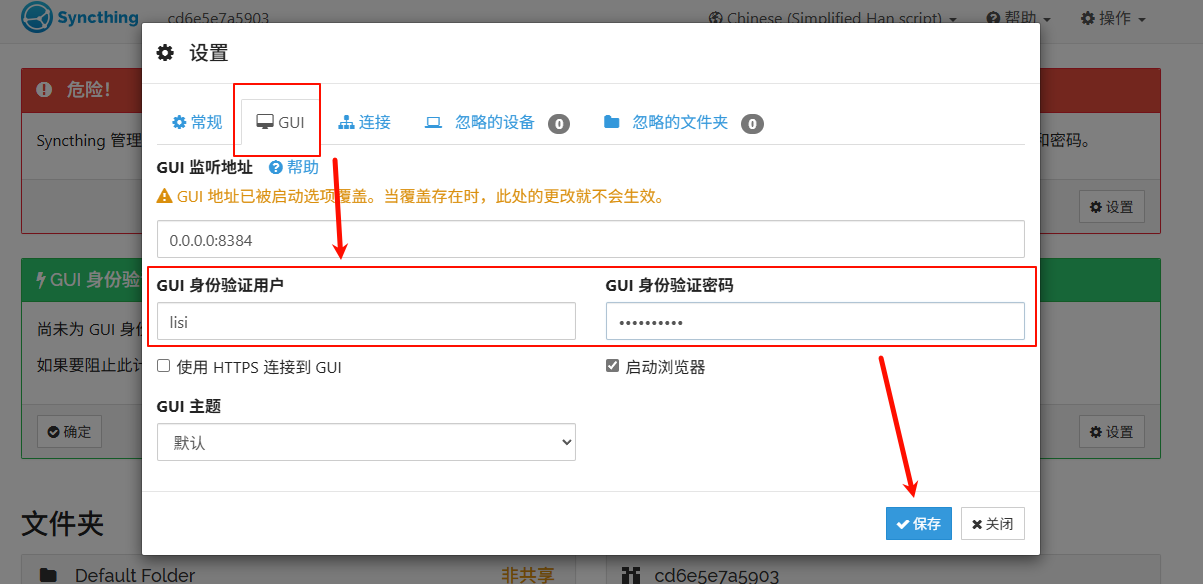 选择GUI选项卡,在GUI身份验证用户和GUI身份验证密码中分别填写用于WebUI登录使用的用户名和密码,点击保存按钮。