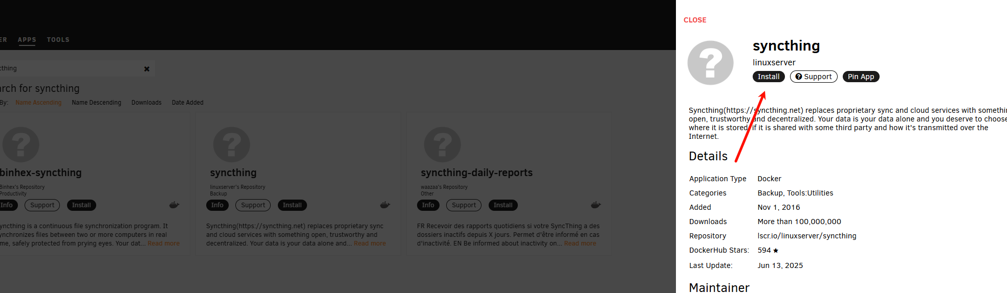 syncthing,选择Repository仓库为lscr.io/linuxserver/syncthing的版本。
