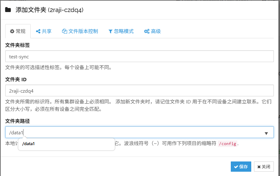 文件夹路径:填写同步文件夹所在的路径,/data1对应之前在部署时Docker配置里填写的容器内路径/data1,即对应容器外路径/mnt/tmp-sync/data1。